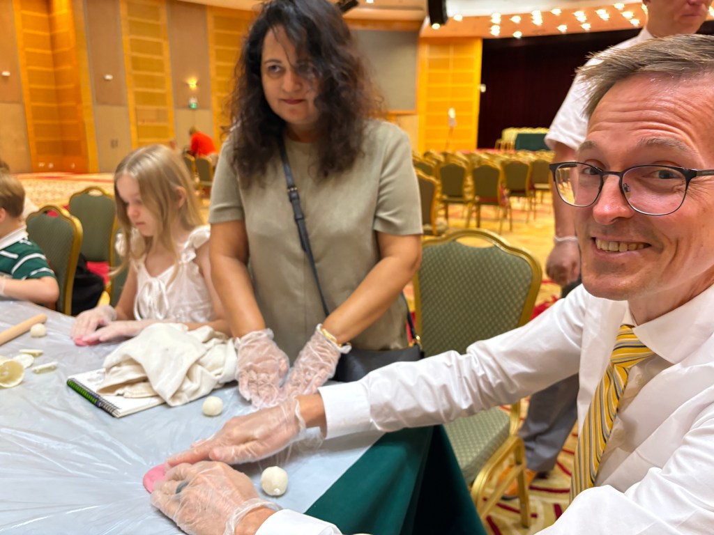 On Sunday, since we were still in Jiading, we attended the Shanghai branch again (no Darcy or Freddy sightings, sadly), and joined their after-church moon cake-making activity. Moon cakes are central to the celebration of the Mid-Autumn Festival. They are sold everywhere during the weeks leading up to the festival, and come in a large variety of sweet and savory fillings (Matt’s work gave him a box of eight, so we’ve sampled a few). A sweet couple from Hong Kong spent 9 hours preparing hundreds of rolled glutenous rice flour balls and a flavored filling centers so everyone could make their own.