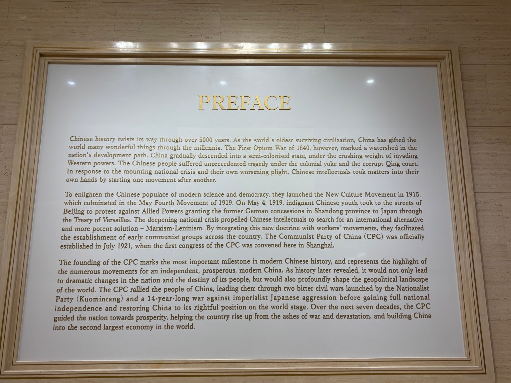National Day commemorates the victory of the Communist Party over the Nationalist Party at the conclusion of country’s 22-year civil war in 1949, which led to the current split between the People’s Republic of China (PRC, aka, China), and the Republic of China (ROC, aka, Taiwan). There’s a museum in Shanghai that marks the site where the Communist Party was founded and tells the story of China’s rise from poverty and foreign domination to what it calls “modest prosperity” and global superpower. Matt visited the site in 2023, and suggested we head there for a history lesson- straight from the CCP.