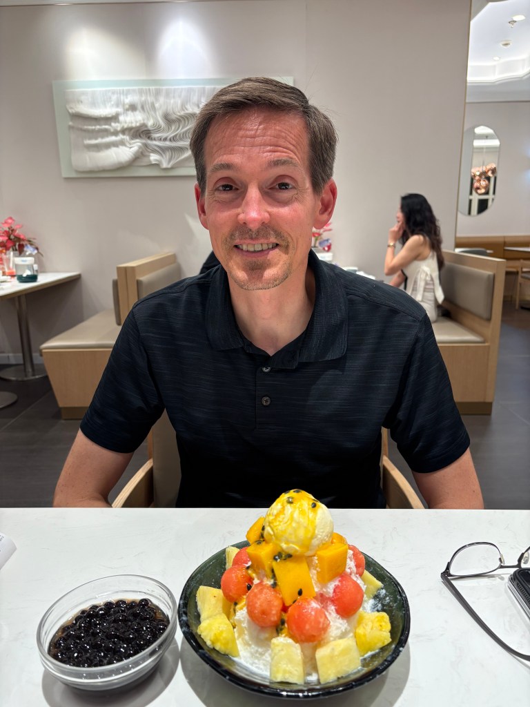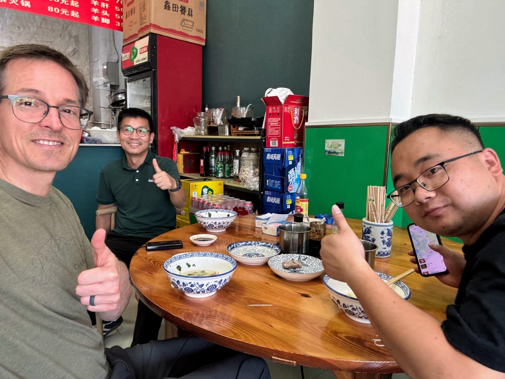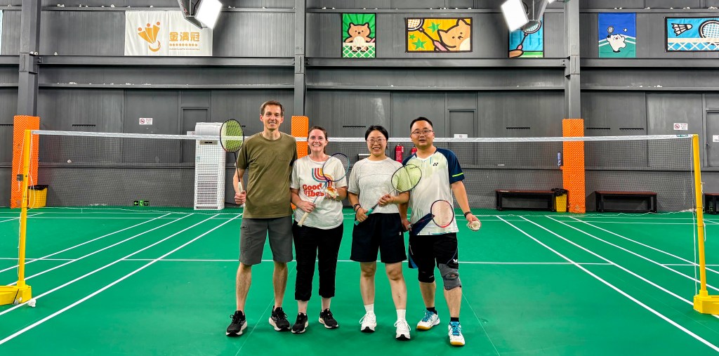 The group looked serious—like they knew their way around a shuttlecock. After a few awkward swings and some warm-up play that mostly involved chasing the birdie across the court, Matt and I started to find our rhythm. We were able to adapt our pickleball form and keep the rally going. Still, we were no match for Yongqiang and his wife. Yongqiang, in particular, could deliver the shuttlecock wherever he wanted, and wherever we weren’t. But we had a great time playing with the pros.